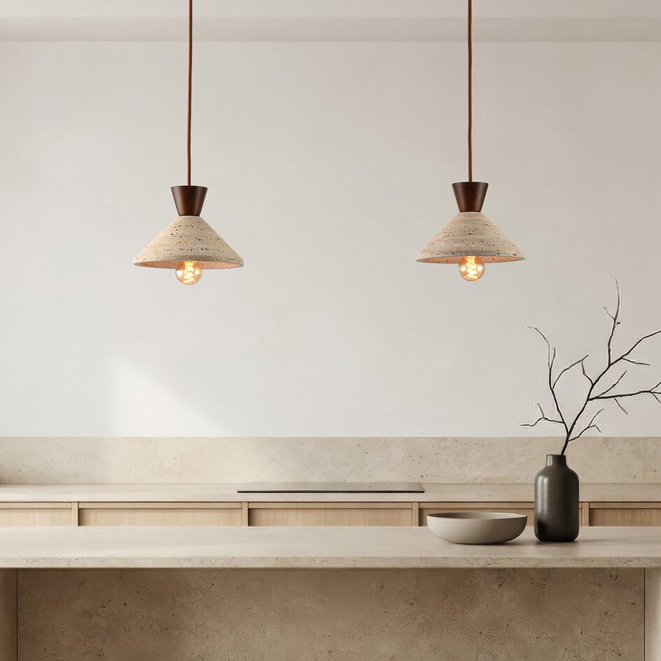 Breng rust en warmte samen in je interieur met dit verfijnde ontwerp. De combinatie van travertin en hout zorgt voor een natuurlijke balans, terwijl de twee conische kappen een harmonieus geheel vormen boven een eettafel of kookeiland. Lees meer.