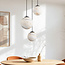 Marbelle is een elegante hanglamp met drie marmerlook glazen bollen in verschillende formaten. De combinatie van een ronde zwarte plafondplaat met de natuurlijke marmerlook bollen zorgt voor een luxe en sfeervolle uitstraling. De glazen bollen (2× Ø20 cm en 1× Ø25 cm) hangen speels onder elkaar, waardoor deze lamp werkt als blikvanger in een hal, hoek van de woonkamer of boven een bijzettafel.