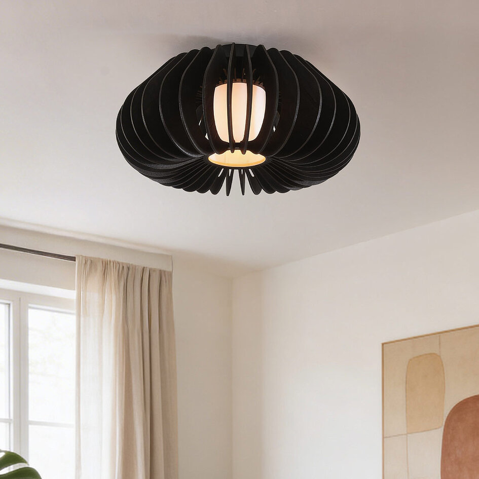 Plafondlamp Roia valt op door haar sculpturale vorm en gelaagde houten lamellen. Het zwarte hout en de open structuur zorgen voor een warm lichtbeeld met een subtiel schaduwspel op plafond en wanden. Aan de binnenzijde is de lamp voorzien van een diffuser, waardoor het licht zacht wordt verspreid en de lichtbron niet direct zichtbaar is. Dankzij het platte ontwerp is Roia geschikt voor ruimtes met een lager plafond, zoals de hal, slaapkamer of woonkamer. De lamp is voorzien van een E27 fitting (lichtbron niet inbegrepen), zodat je zelf de sfeer bepaalt.