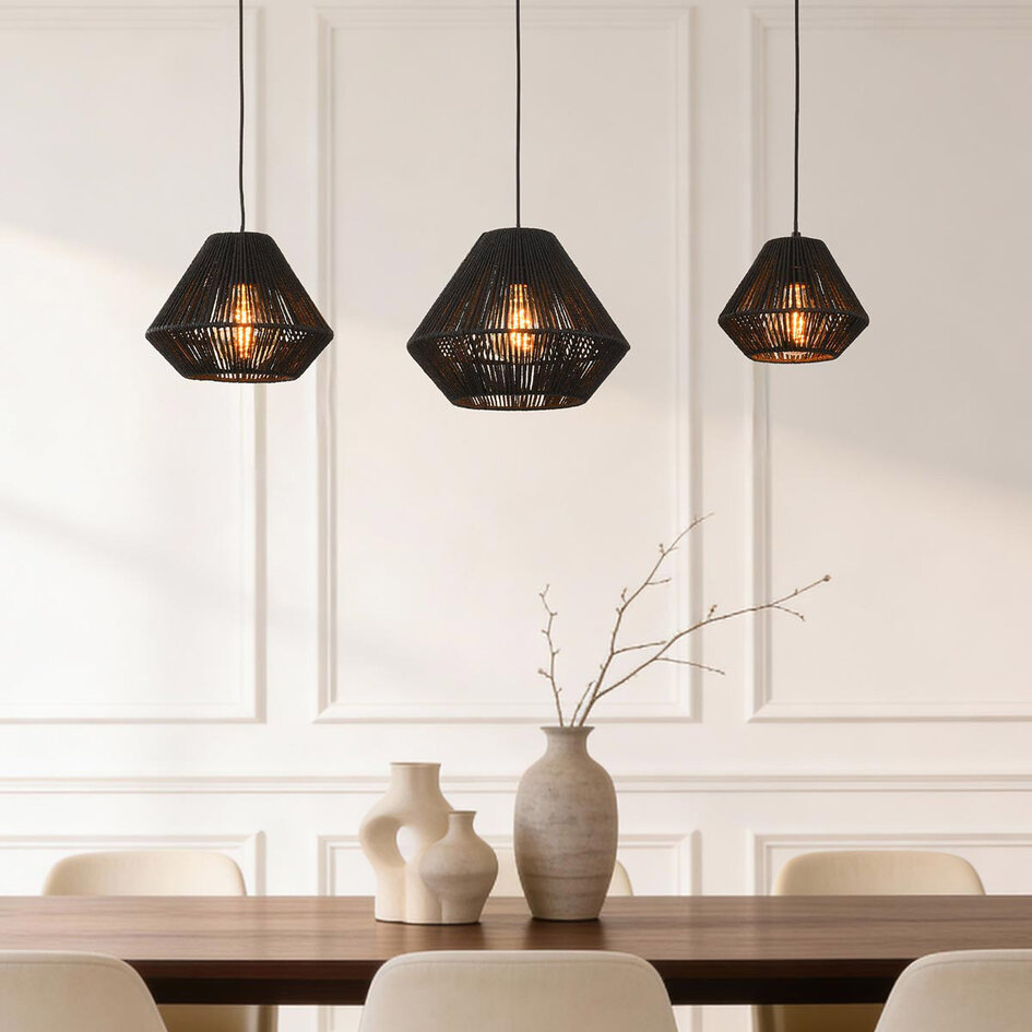 Hanglamp Ives combineert drie handgemaakte kappen van zwart papiertouw in verschillende afmetingen tot een strak en evenwichtig geheel. De kappen hangen aan een langwerpige plafondplaat die balans brengt in de ruimte en de lamp een rustige uitstraling geeft. Het open vlechtwerk filtert het licht op een zachte manier. Ives is voorzien van drie E27 fittingen (lichtbronnen niet inbegrepen), zodat je zelf de lichtbron en lichtsfeer kiest.