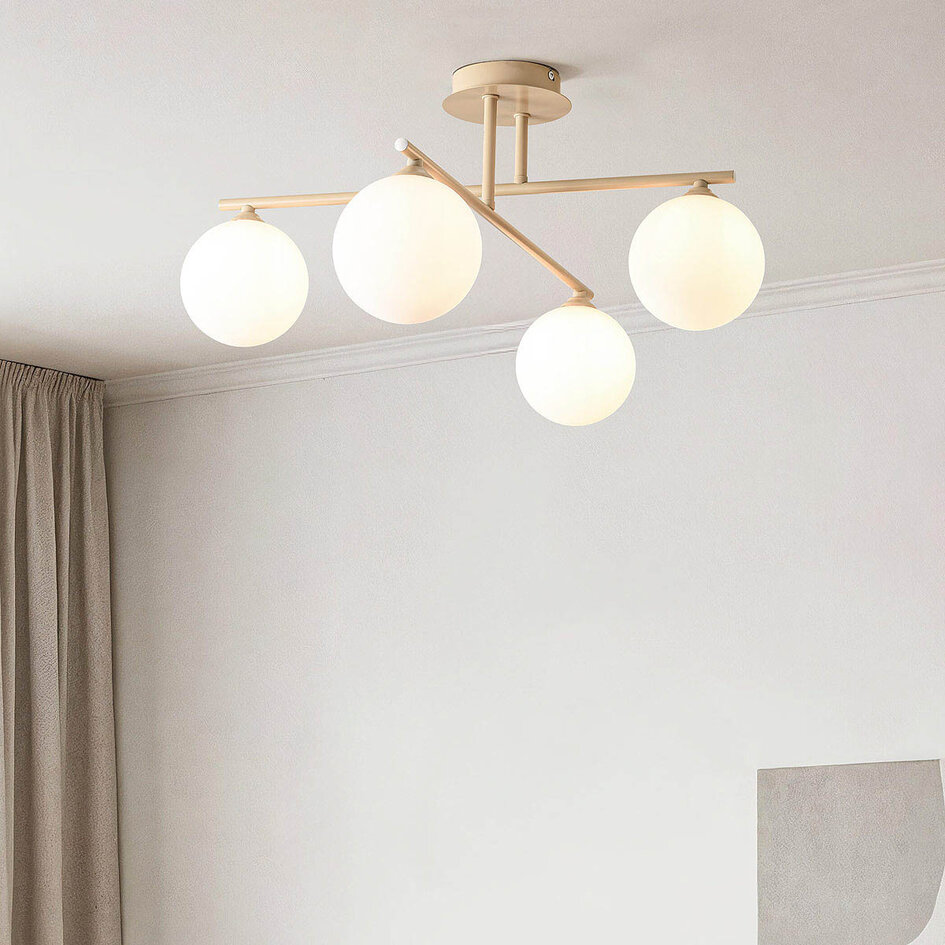 Plafondlamp Nymo brengt elegantie en flexibiliteit samen in één ontwerp. Het beige frame met vier Ø12 cm melkwitte glazen bollen verspreidt een zacht, gelijkmatig licht dat elke ruimte een warme en stijlvolle uitstraling geeft. De gekruiste stangen kunnen worden gedraaid, zodat je zelf bepaalt of de lamp een kruisvorm of een langwerpige opstelling krijgt – twee designs in één. Met twee G9 fittingen (lichtbronnen niet inbegrepen) kun je je eettafel, woonkamer of slaapkamer sfeervol en stijlvol verlichten.